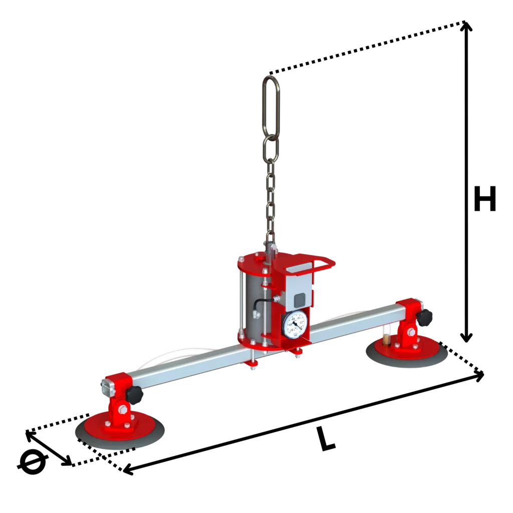 2 przyssawki o średnicy Ø 230 mm są automatycznie zaciskane i zwalniane dzięki specjalnemu mechanizmowi cyklicznemu – operator steruje więc jedynie suwnicą, na której zawieszony jest chwytak.